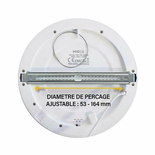 Ce plafonnier LED MIIDEX blanc au design arrondi et sobre possède un diamètre de perçage ajustable allant de 53mm à 164mm ainsi il est adaptable et peut vous éviter des travaux supplémentaires.