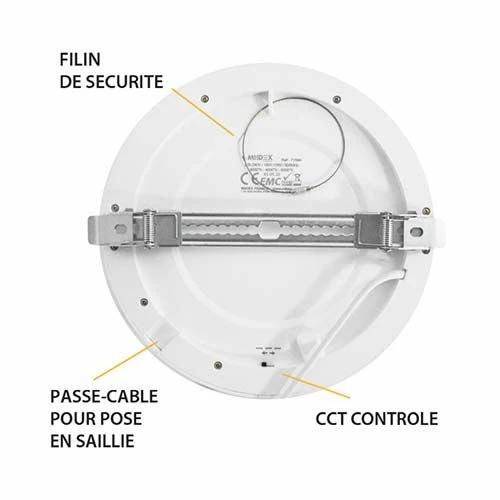 - Sécurisez ce downlight LED avec son filin de sécurité inclus. Ce câble permet de relier votre plafonnier à la structure de votre bâtiment ainsi en cas de défaillance du plafond, votre luminaire sera retenu par ce filin.