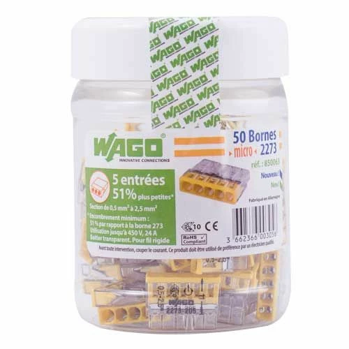 WAGO S2273 50 mini bornes de connexion rapide 5 entrées pour fils rigides – 2273-205
